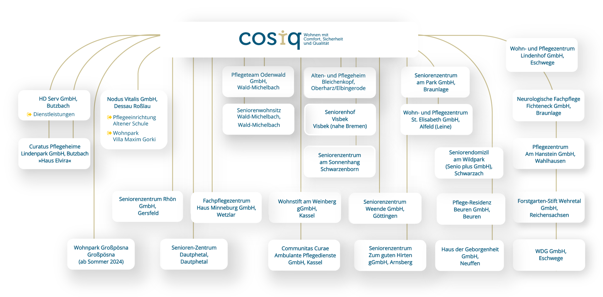Die cosiq GmbH ist eine Holdinggesellschaft für Wohnen im Alter, innovative Seniorenpflegekonzepte sowie psychiatrische und neurologische Fachpflege. Wir entwickeln moderne, leistungsstarke Dienstleistungen für ein Leben mit Unterstützungs- und Betreuungsbedarf.